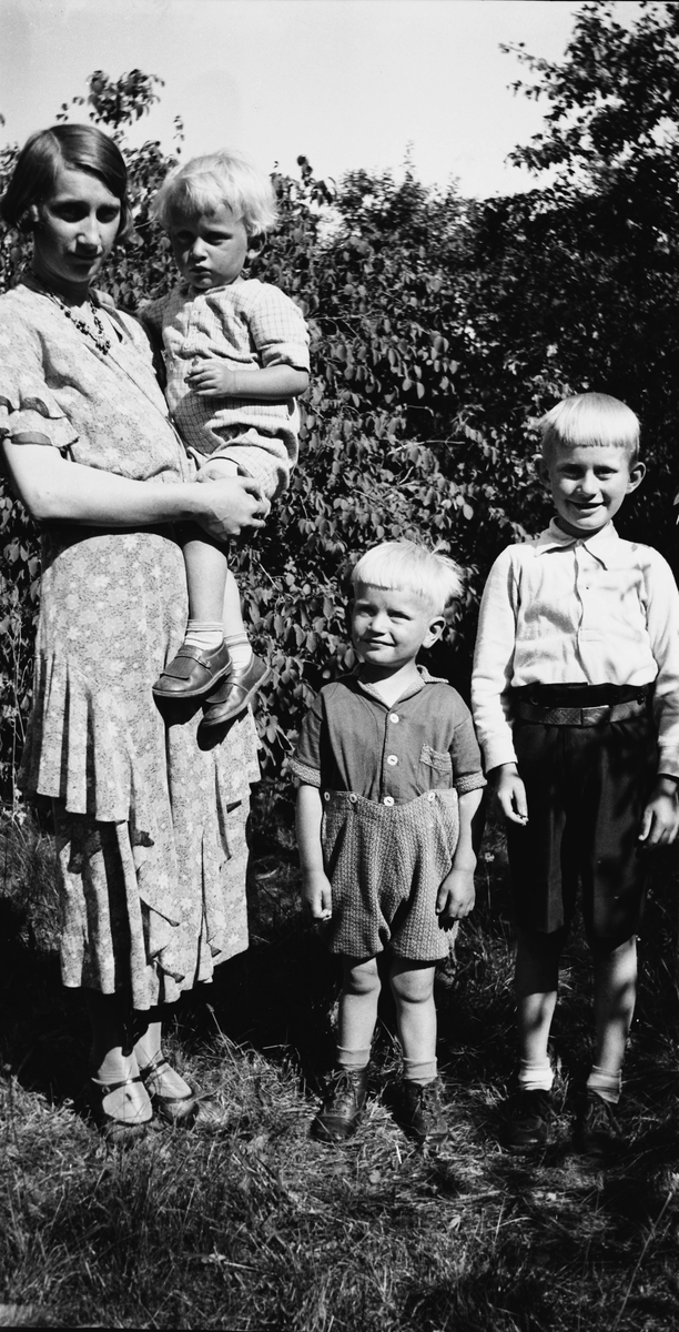 En kvinna i blommig volangklänning med tre pojkar i trädgården. Medan byxorna på gossen till höger bärs upp av ett skärp har kortbyxorna på grabben i mitten helt sonika fästs med knappar i skjortan.