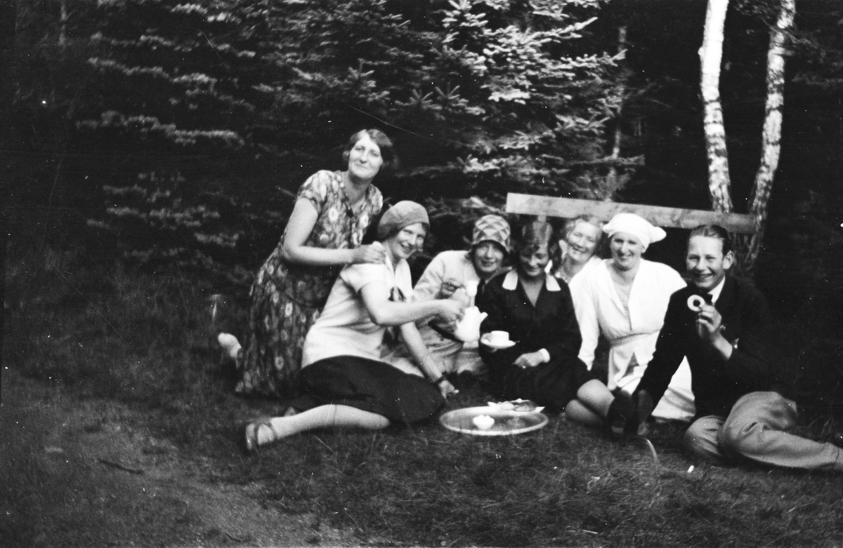 Sex kvinnor och en yngling poserar glatt med en kaffebricka i en skogsdunge. Den unge mannen håller upp en så kallad Marboring - en kaka typisk för Mark och trakterna däromkring.