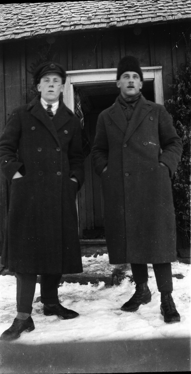 Två vinterklädda ynglingar står utanför dörren till en stuga i snö.