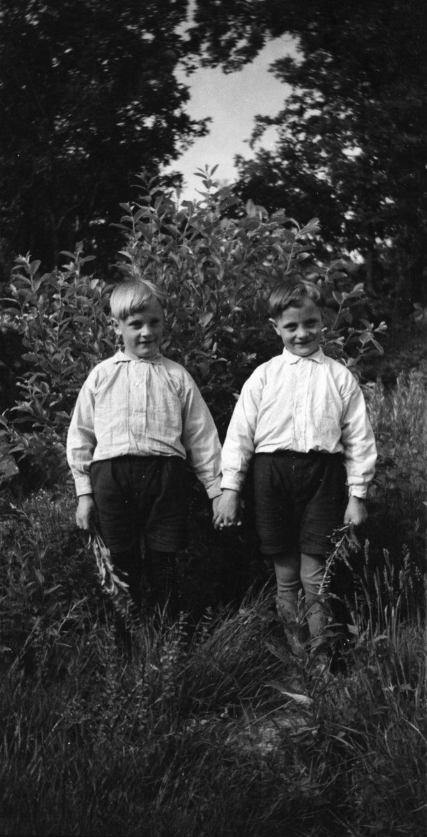 Bröderna Einar och Vidar Klasson står i högt gräs vid en buske och håller varandra i händerna. Med andra handen håller de varsin kvist.