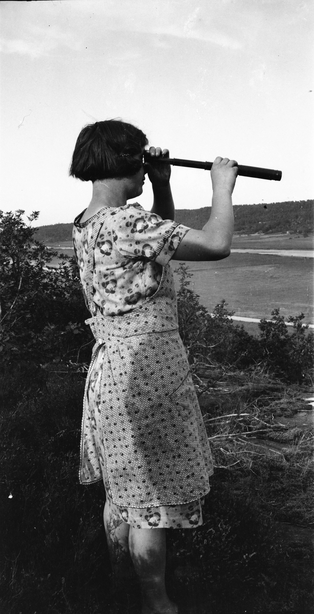 En ung kvinna i blommig klänning och förkläde står på en höjd och spanar över nejden med en "piratkikare" (teleskopkikare).