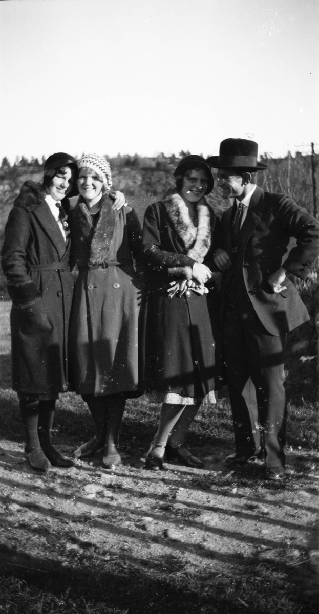 Några ungdomar poserar glatt i förmodat tidig vårsol. Mannen bär hatt och kostym och de tre flickorna har pälsbrämade kappor och mössor på sig.