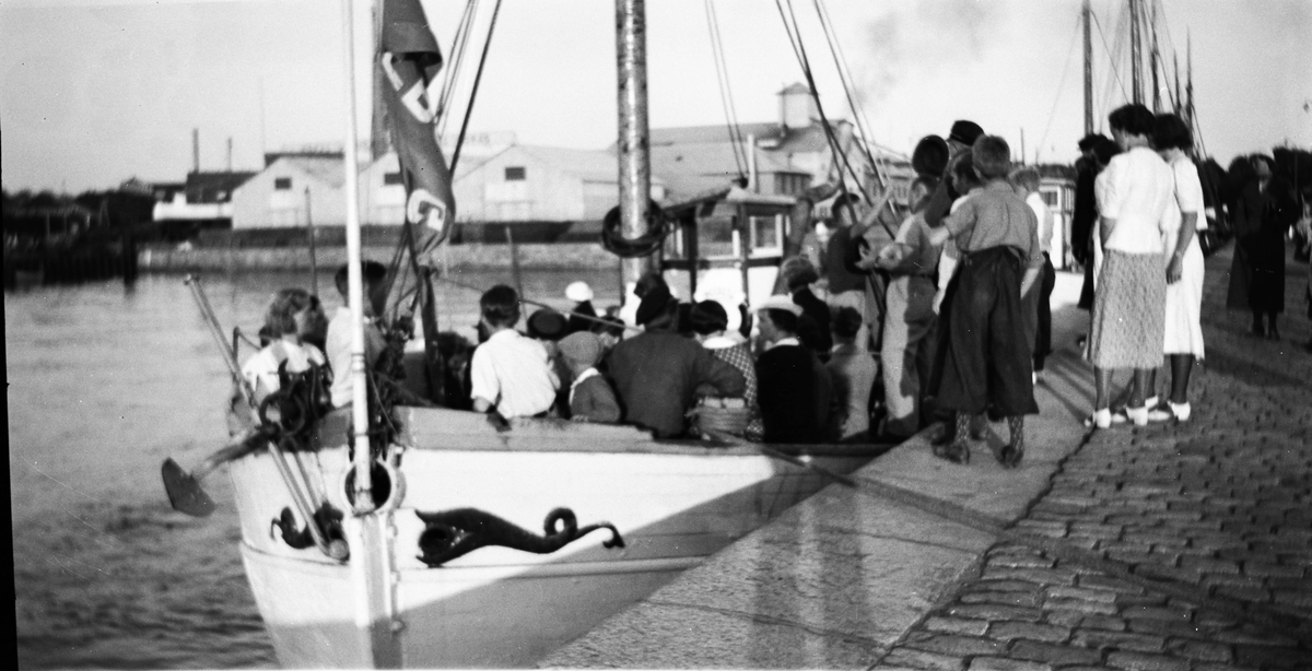 Båt av fiskebåtstyp full med finklädda människor vid kaj i Varberg. Av bokstäverna på skeppets flagga är det Getteröbåten Ingeborg. I bakgrunden syns hamnmagasinen.