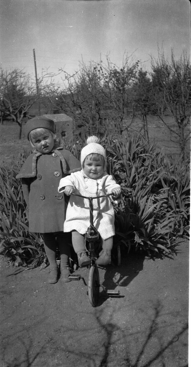 Två små flickor i en trädgård med finkappor och mössor. Den minsta sitter på en trehjuling.