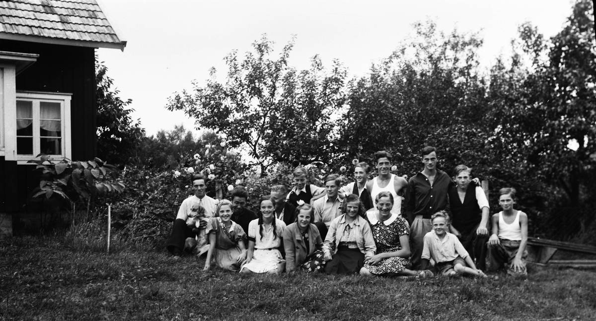 Sexton ungdomar från Drared sitter i trädgårdens gräs. Ynglingen längst till vänster håller en hund och pojken längst till höger är Gösta Andersson på Slätta. Det är sensommar eftersom dahlior blommar i rabatten bakom dem. Husknuten skymtar till vänster i bild.
