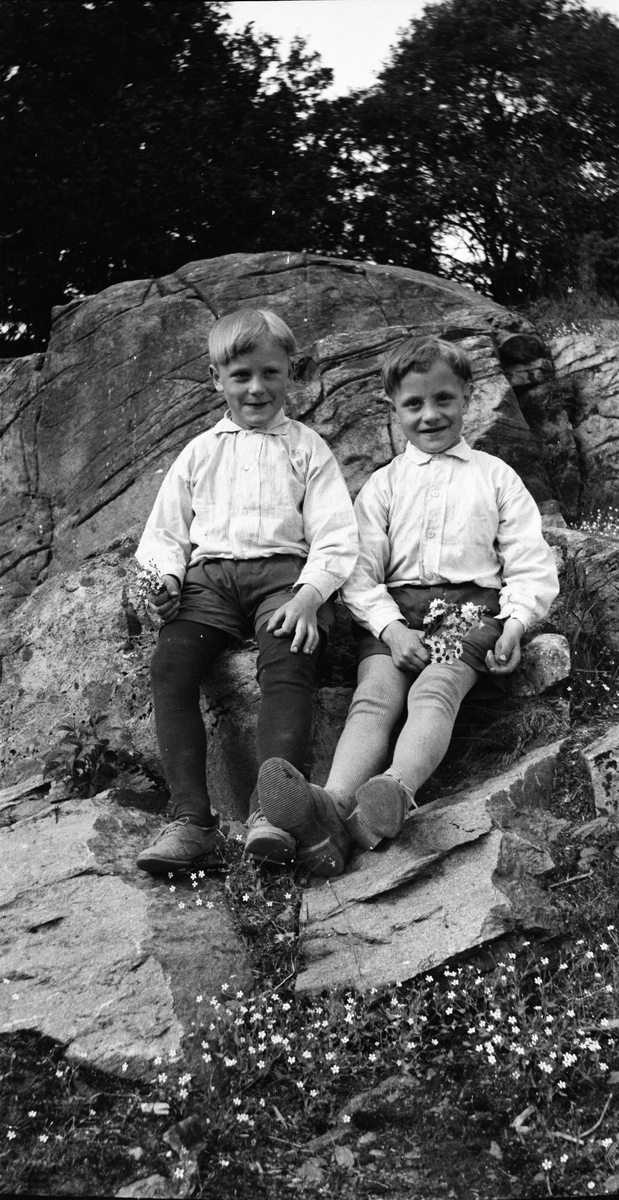 Två små pojkar sitter på en berghäll med varsin blombukett i handen. De är klädda likadant i skjortor, kortbyxor, strumpor och skor.