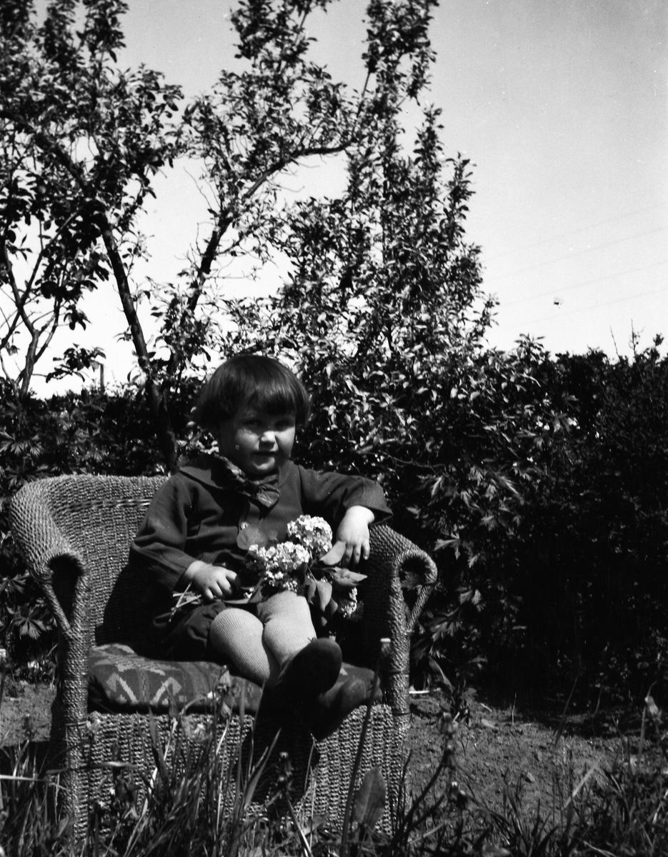 Ett litet barn sitter utomhus i en korgstol med några syrenkvistar i knät.