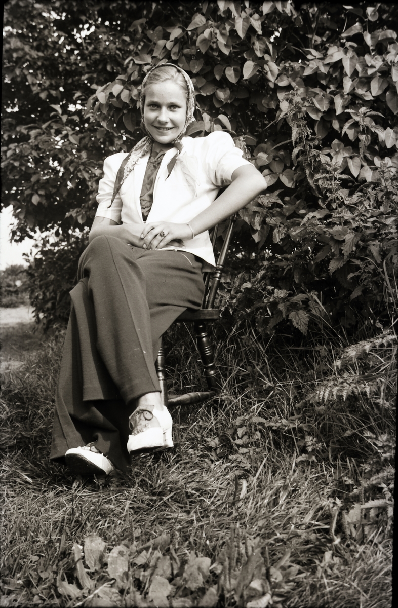 Anna-Lisa i Hugalyckan sitter på en pinnstol vid en syrenbuske, farligt nära stora nässlor. Hon är klädd i vida byxor, ljusa klackskor med hög rosettförsedd plös, vit kort kavaj med puffärmar, halsband med hjärtberlock, ring med stor sten, armband och en sjalett om huvudet.