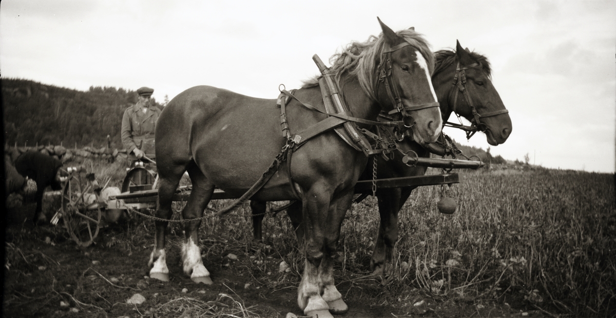 Karl Snygg med sin potatismaskin spänd bakom två hästar.