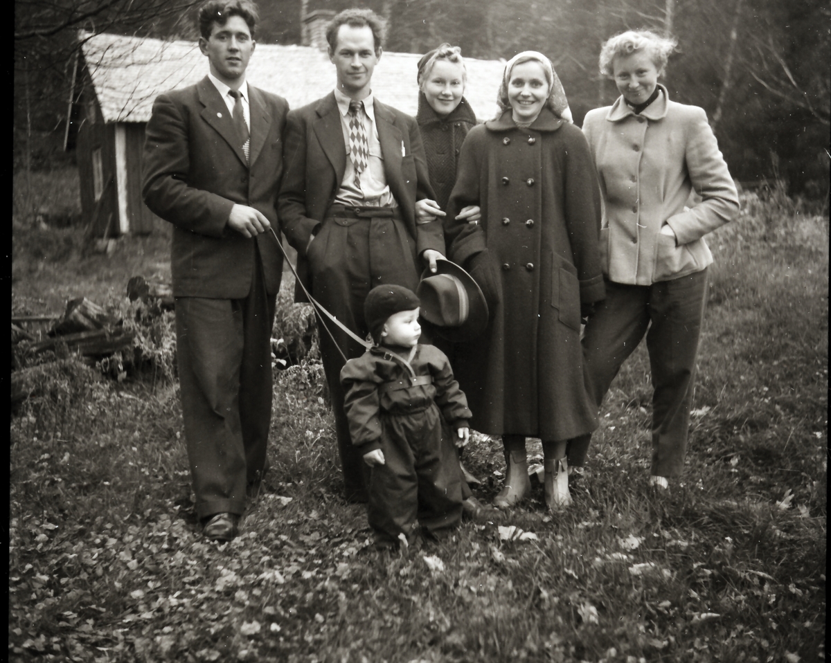 Ett sällskap står framför Persgårds stuga i skogen. Mannen längst till vänster heter Gösta Svahn och han håller lilla dottern Margareta i overall framför sig i en sele. Längst till höger står hans fru Inga och baktill står hennes syster Eva. Paret i mitten är Inga och Evas kusin Anna-Lisa och hennes make smeden Nils.