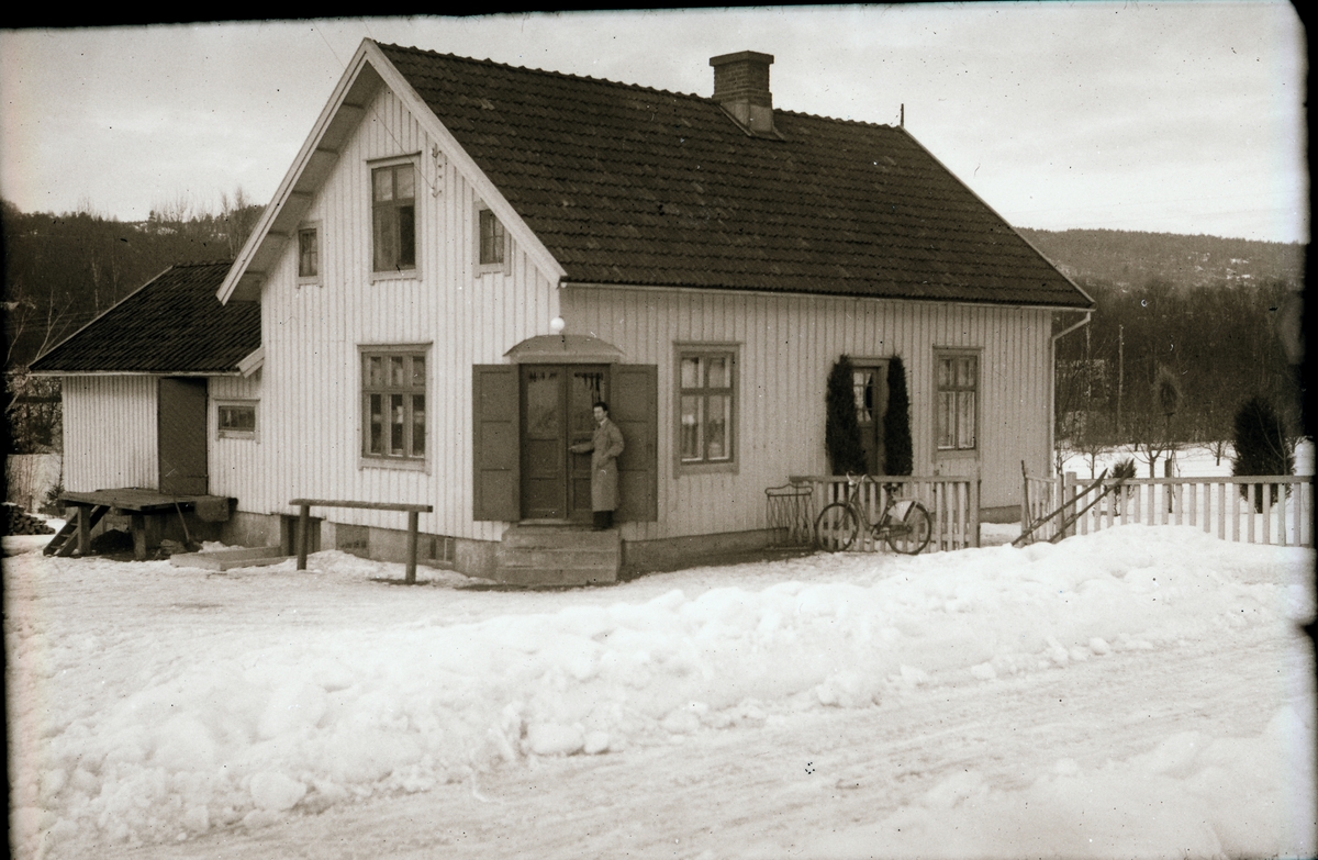 Fageråkras lanthandel Filialen i vinterskrud. Handlare Ottosson står i butiksrock vid entrén, på typiskt butiksmanér förlagd till en avskuren gavel. Till vänster syns en liten lastbrygga och intill den ett räcke att parkera hästen vid.