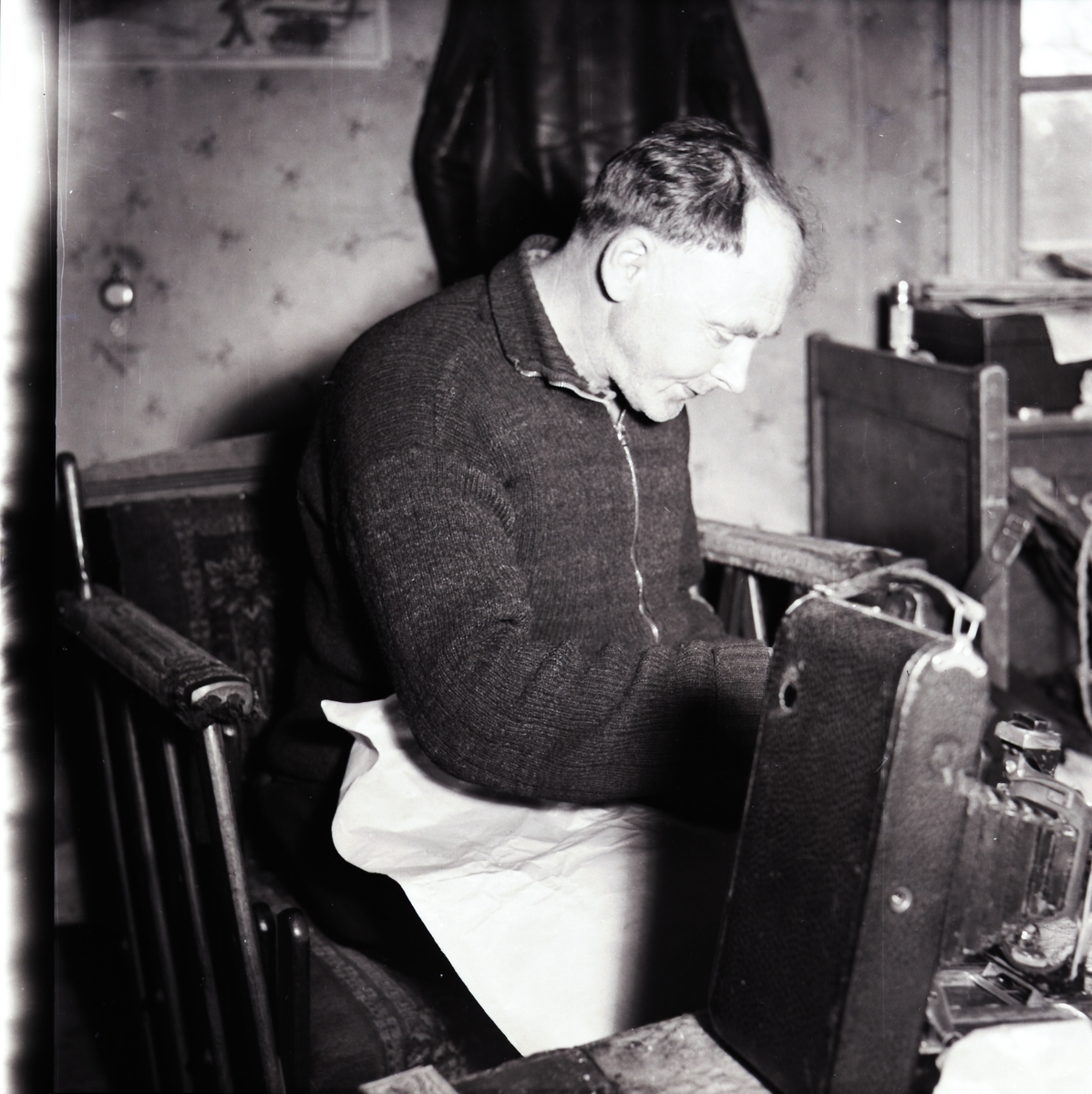 Kloar-Erik sitter och fixar med en gammal kamera.