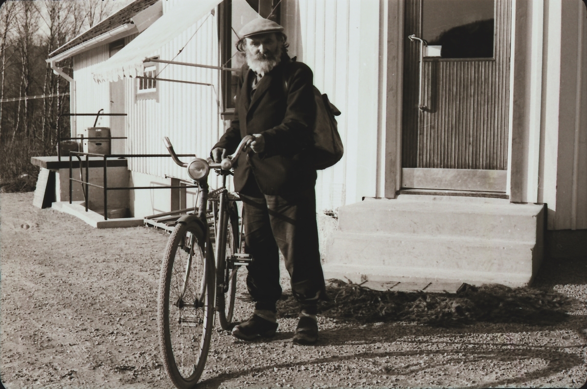 Kloar-Erik med cykel utanför "Filialen", en lokal handelsbod.