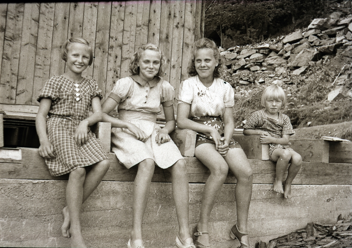 Fyra flickor på Sågbäcken i Albäck; fr v Kerstin Johansson, Amy Arvidsson Åskloster, Ingrid Lindgren och ett litet sommarbarn från Göteborg.