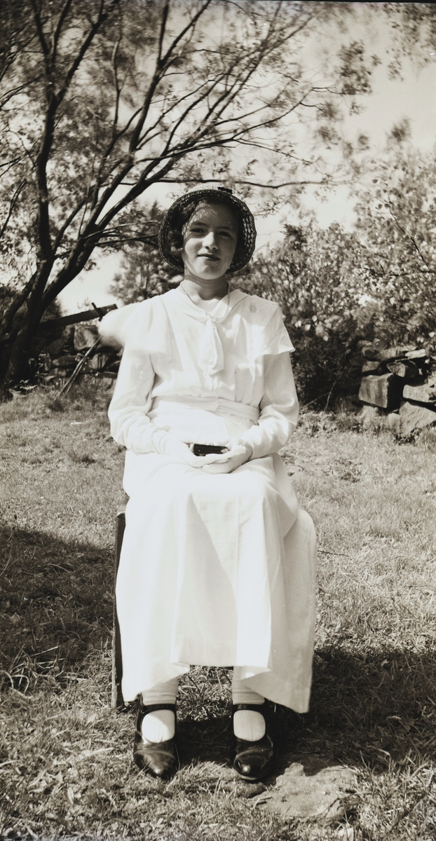 Anna Snygg sitter konfirmationsklädd med hatt och pärlhalsband på en stol i trädgården. I händerna håller hon psalmboken.