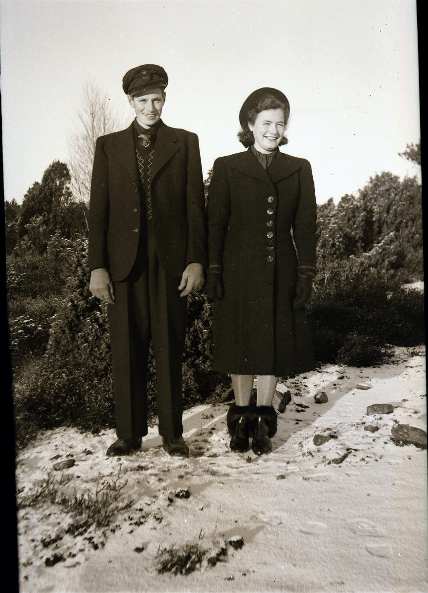 Karl och Anna Snygg står finklädda i lätt snöig terräng med enebuskar.