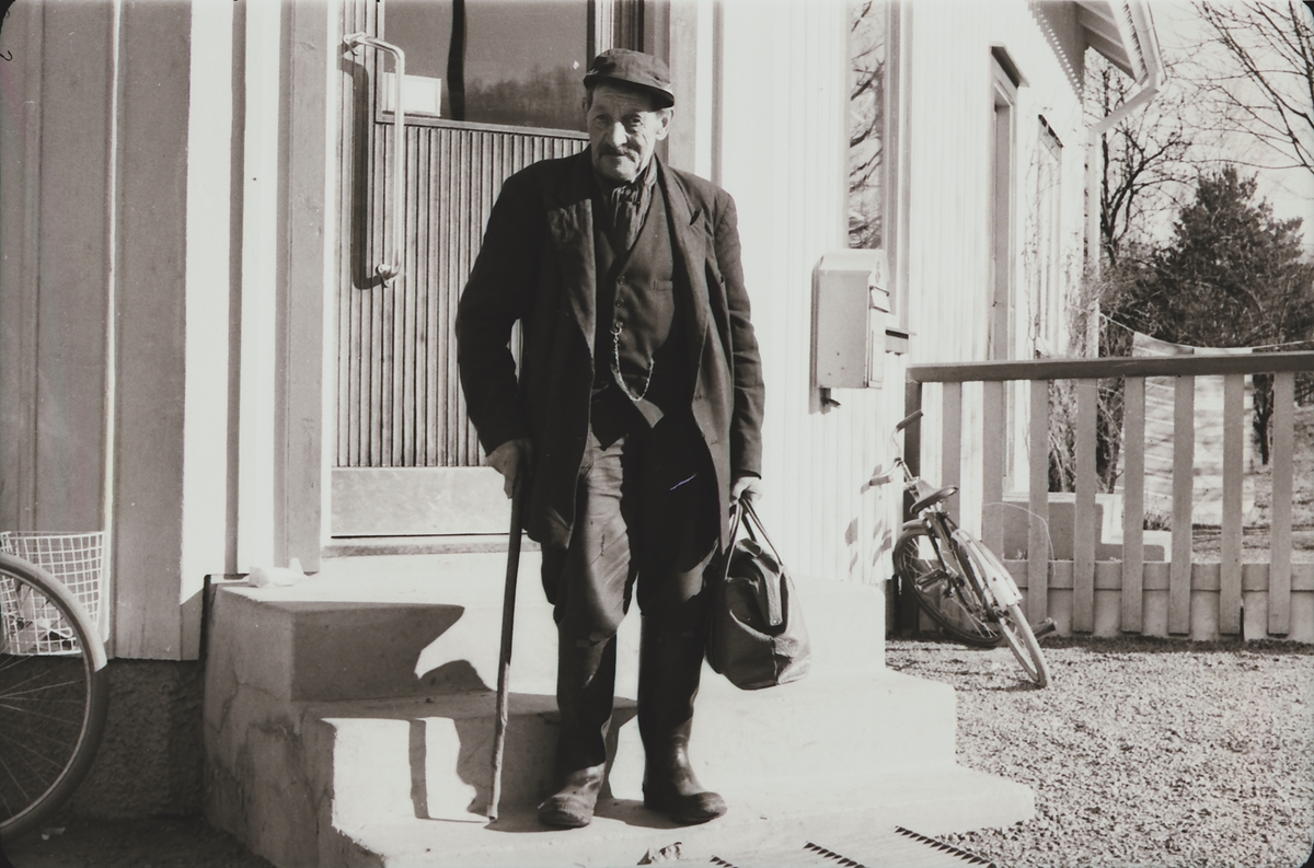 August Karlsson Snygg på trappan till affären Filialen i Veddige. På väggen till höger sitter en brevlåda.