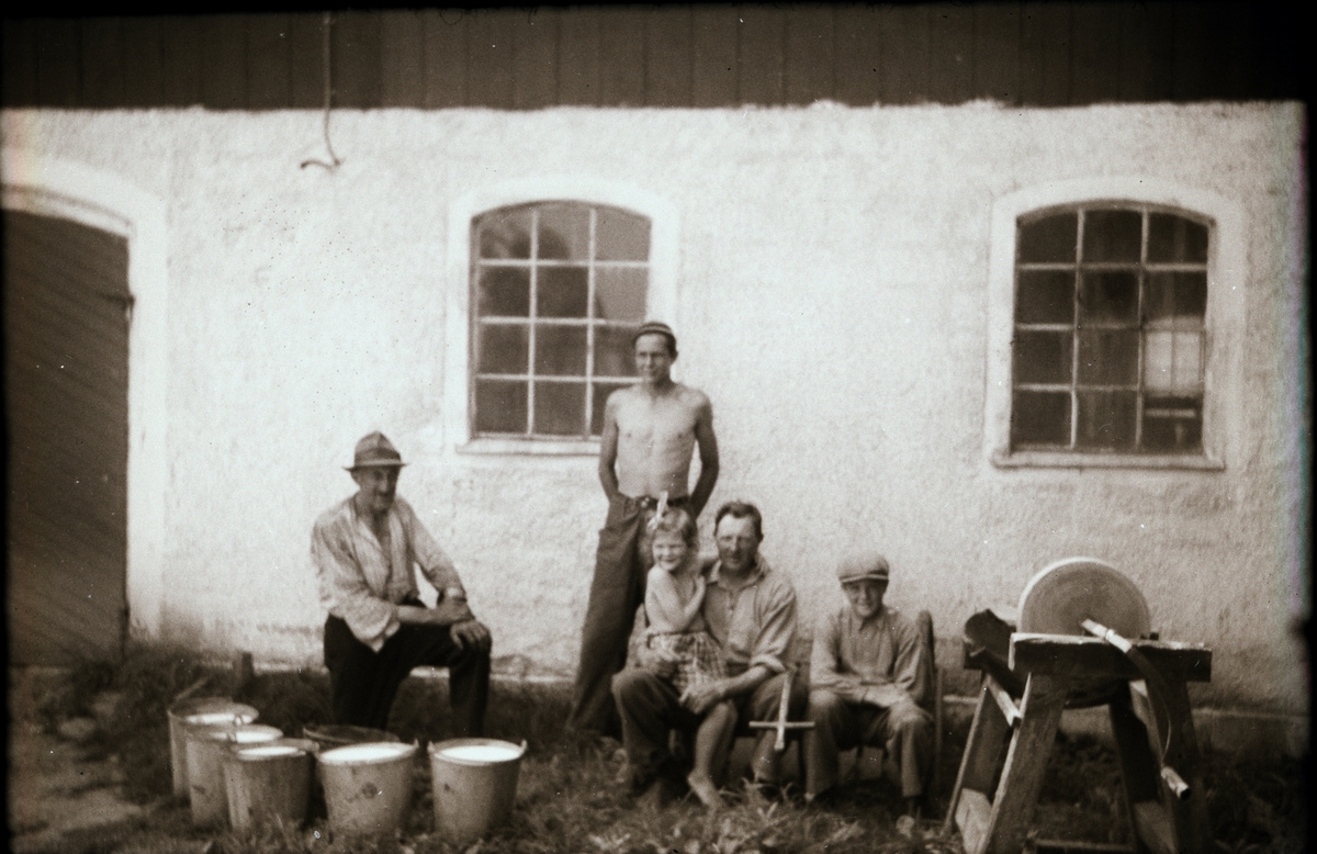 Gustaf på Lövagård med drängen Ingvar Henriksson stående vid ladugårdsväggen med två spröjsade, välvda fönster. Flickan heter Ann-Marie. Fem mjölkspänner står till vänster och till höger står en slipsten.