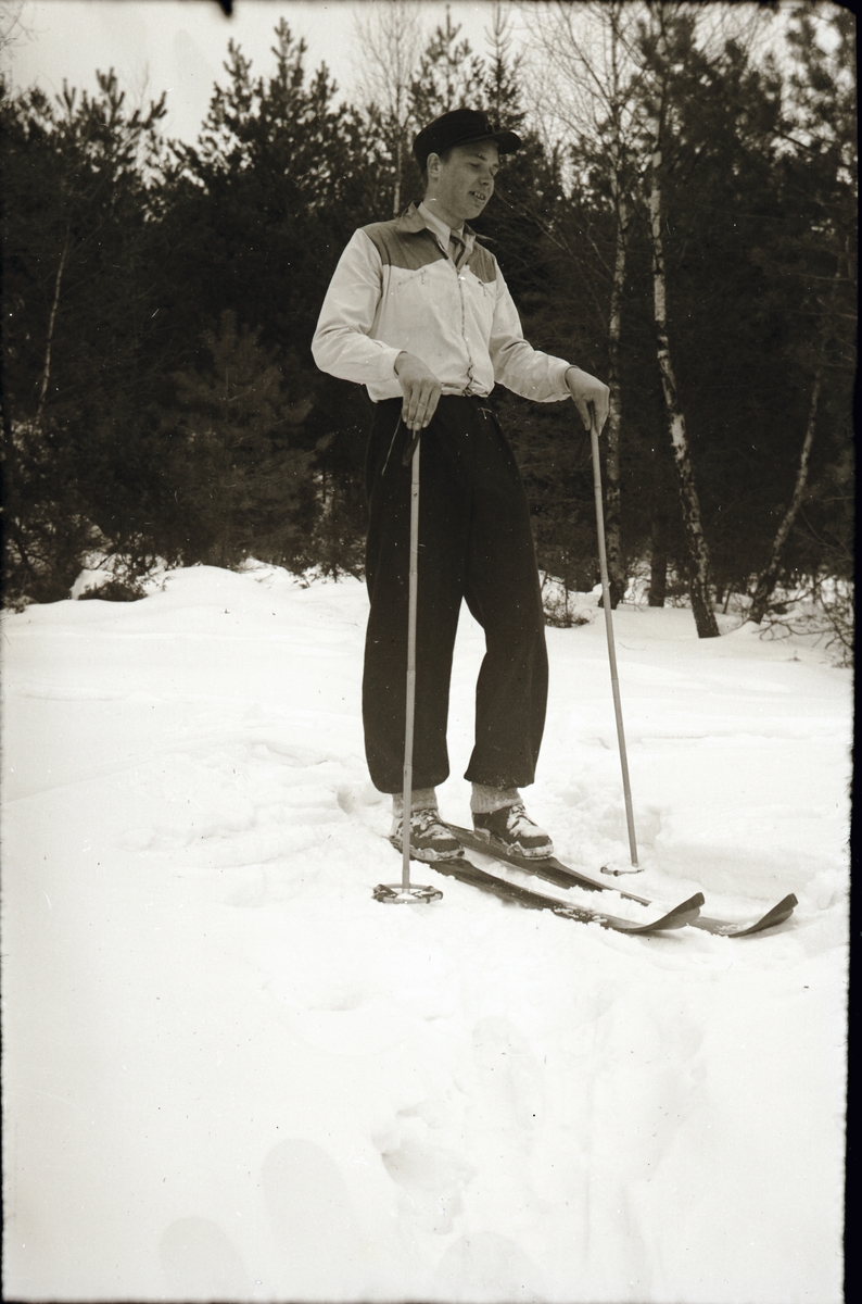 Ung man poserar på skidor, Kjell Börjesson i Lövagård. (Se även bild EA0335)