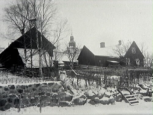 Träbebyggelse och Laholms kyrka i bakgrunden.