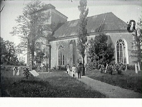 Tyresö kyrka i Södermanland med ett sällskap på väg från kyrkan. Damerna har parasoll.