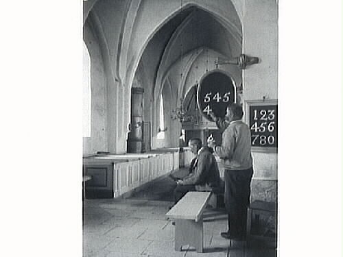 Två män i en kyrka. Den ene är troligen kyrkvärd och sätter upp psalmnumren, den andre sitter bredvid på en bänk och läser. I bakgrunden syns en stor kamin. Inga uppgifter om kyrka eller personer.
