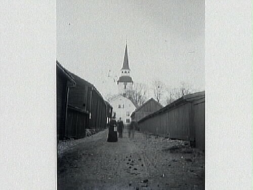 Människor på en gata med Mariefreds kyrktorn i fonden, Södermanland. Kyrkan skyms av ett stort vitt hus i änden av gatan.