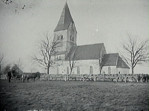 Exteriörbild av Havdhems kyrka på Gotland taget före 1912 (då tornets gallerivåning togs ned). Ett hästekipage med två män i förgrunden. Framför kyrkmuren står en staketliknande anordning hästarna förmodligen bands vid under kyrkobesöket.