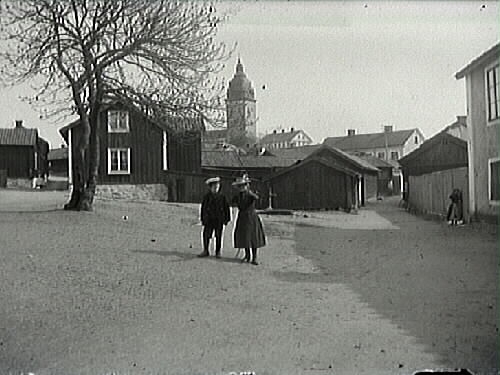 Stadsvy med Strängnäs kyrktorn i bakgrunden. I förgrunden två finklädda barn på en platsbildning med pump.