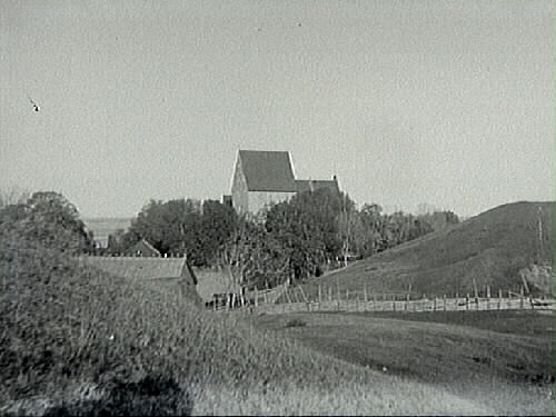Gamla Uppsala kyrka i Uppland med hankgärdesgårdar och en av högarna i förgrunden.
