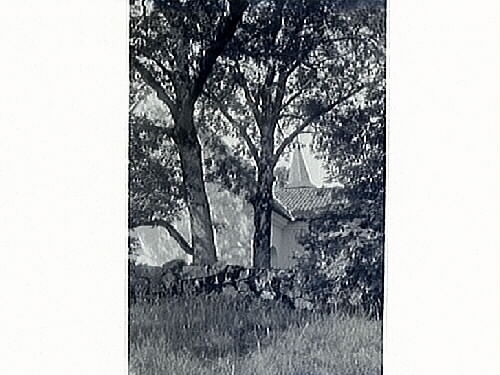 Okänd kyrka på okänd ort. Kyrkmur och träd i förgrunden, torntaket i bakgrunden.