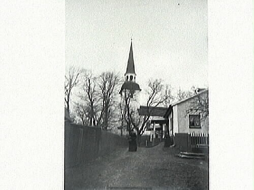 Mariefreds kyrka i Uppland med intilliggande staketomgärdade hus i förgrunden, samt två kvinnor.