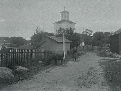Okänd kyrka på okänd ort (samma kyrka som på neg. nr. E5516). I förgrunden en lösgående betande ko bland bebyggelsen samt en flicka vid gatlykta bakom kon.