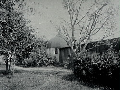 Trädgård med sex- eller åttakantligt (lust)hus med liten spira som står invid en långsträckt byggnad.