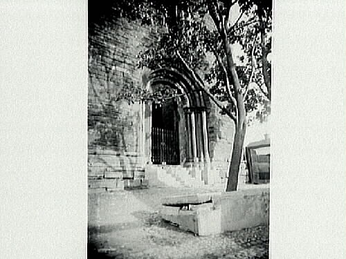 Kyrkportal med grind. Intill skymtar ett gammalt staket samt en port med överliggare in till kyrkans område. Okänd kyrka på okänd ort, troligen kyrkoruin.