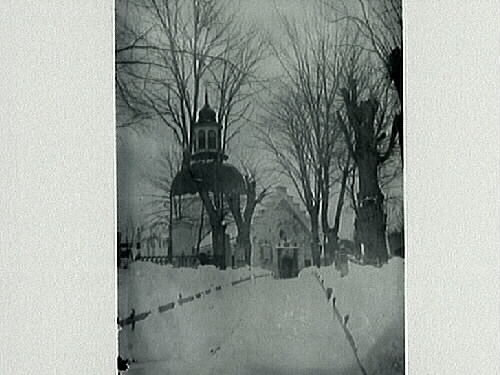 Snöbild av okänd kyrka med runt torn och trappstegsgavel.