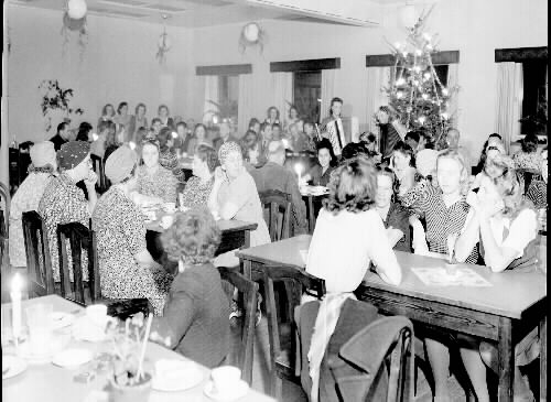 Personalen sitter till bords och firar jul på Malmö Yllefabrik i Varberg. Ett par kvinnor underhåller på dragspel. Kv Vävaren, Norra vägen 27.