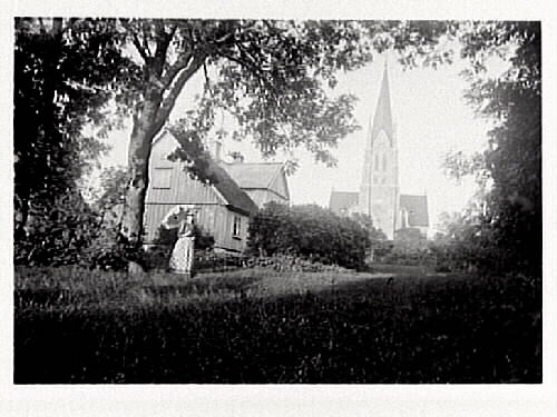 En kvinna med parasoll står i trädgården vid ett hus med Årstads kyrka i bakgrunden.