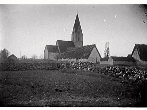 Öja kyrka sedd från norr med omgivande byggnader och stenmur, Gotland.