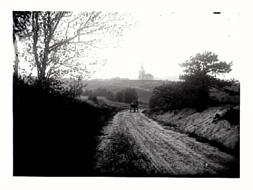 Naturbild med Asige kyrka. Buskar i förgrunden ovan ett vattendrag med kyrkan i bakgrunden på en kal kulle.