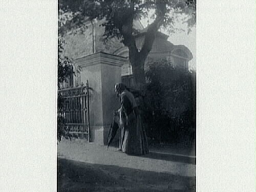 Kvinnoporträtt. Äldre kvinna med huckle och paraply på väg in genom en kyrkgrind. Ett bårhus eller liknande syns till höger.