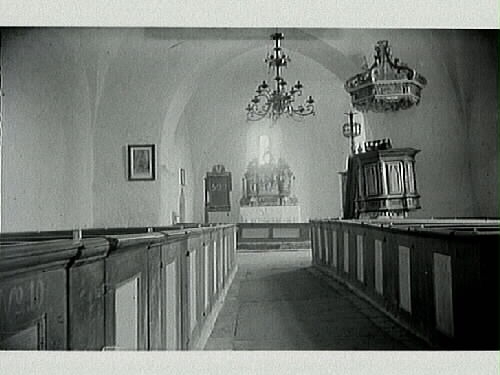 Interiör från okänd kyrka. Altargång, altare, predikstol, kyrkbänkar.