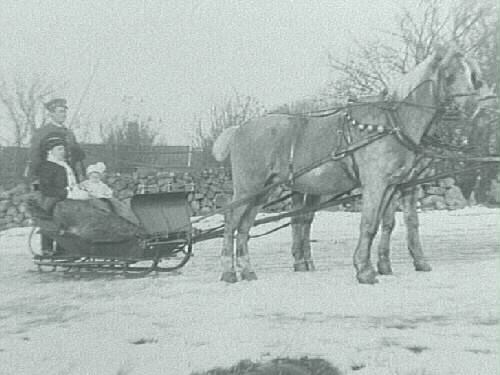 Ett par hästar och släde. Hästarna har bjällror. I släden sitter en kvinna och ett barn. Bak på släden står en kusk som håller i en piska. I bakgrunden en stengärdsgård och bortom den syns taket på ett hus.
