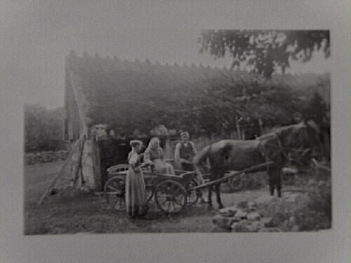Motiv på Severin Nilsons Björsgård i Asige. Ett yngre par vid ett hästekipage med en äldre kvinna i vagnen, möjligen Severins mor Neta Beata, framför en lada av skiftesverk. Det är södra längan på Björsgård och till höger skymtar vårdträdet med stenfot.