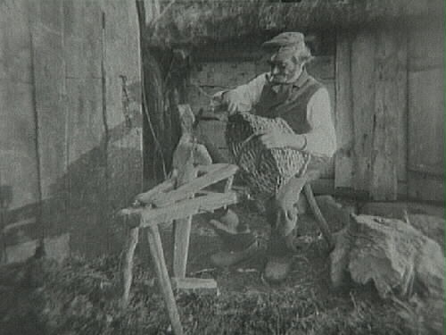 Henrik Bengtsson i södra Björsgård sitter på en 'träskomärr' - en anordning man använde vid träskotillverkning - och tillverkar en korg. Han har en pipa i munnen, träskor och sitter vid en skiftesverkslada med halmtak. (Se även bildnr VMA 6719_2.)