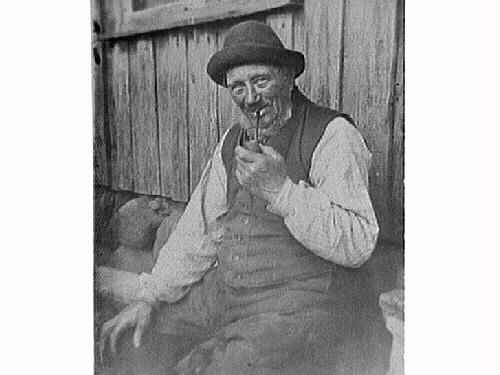 Lars på Lien. Piprökande man i hatt sittande på en bänk utanför stuga.