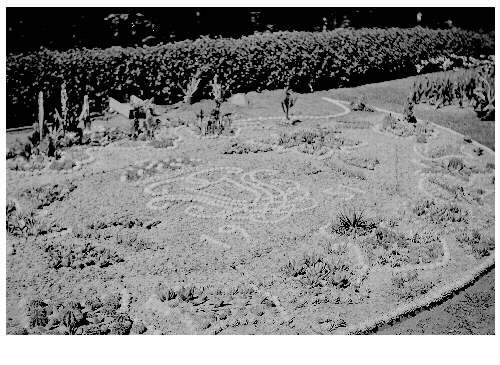 Kaktusplanteringen i Järnvägsparken 1951. Detta år formades kung Gustav VI Adolfs namnskiffer till det centrala mönstret. Han hade krönts till konung i oktober året innan.