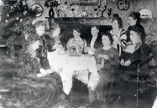 Nio handarbetande damer runt ett bord vid julgranen. Kanske är det ett symöte eller något julfirande hos Alida (eller hos Mathilda Ranch?) Beställare: Alida Svensson.