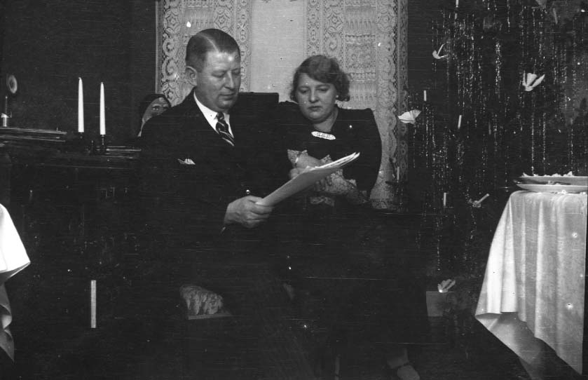 Interiör från en bostad. I hörnet står en julgran och en tomte kikar upp bakom mannens axel. En kvinna och en man sitter och läser. Personerna är inte identifierade.