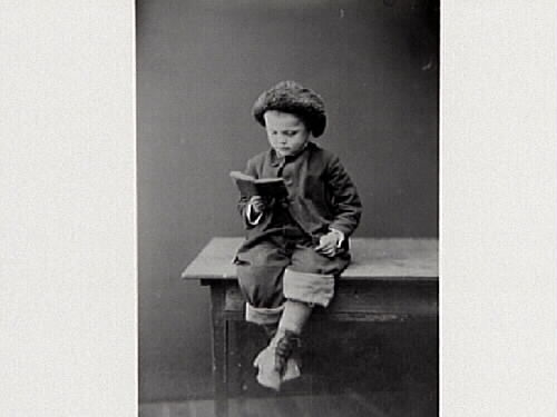 "Lasse och långkatekesen", förlaga till en målning. Pojke i mössa läser i en bok, sittandes på ett bord.